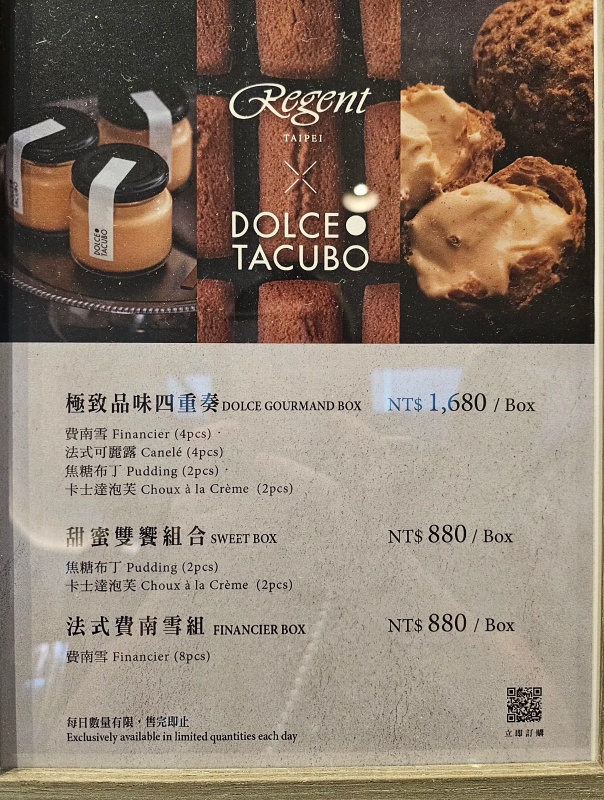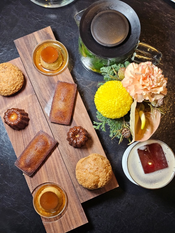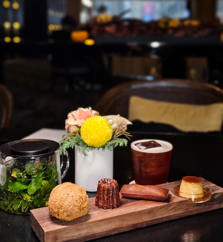 包含現烤費南雪、法式可麗露、焦糖布丁、卡士達泡芙各一份以及附咖啡或茶。