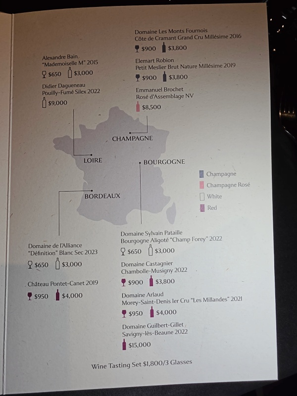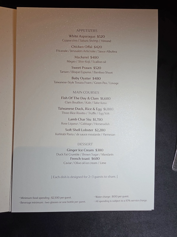 [用餐]每位客人新台幣2,500元起的食物. 最低飲料訂購:兩杯葡萄酒或一瓶 ,水服務每位客人NT$100+10%服務費