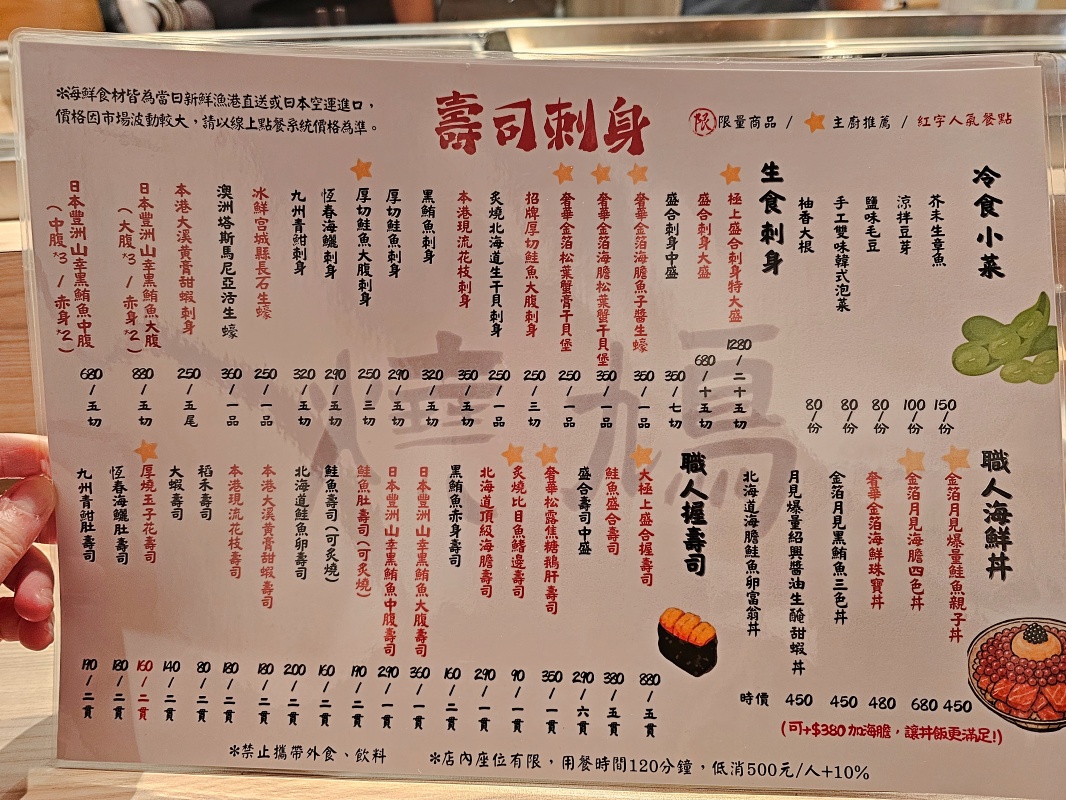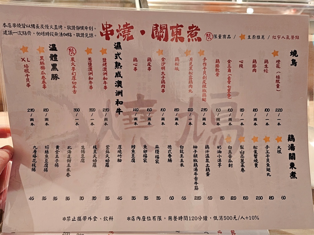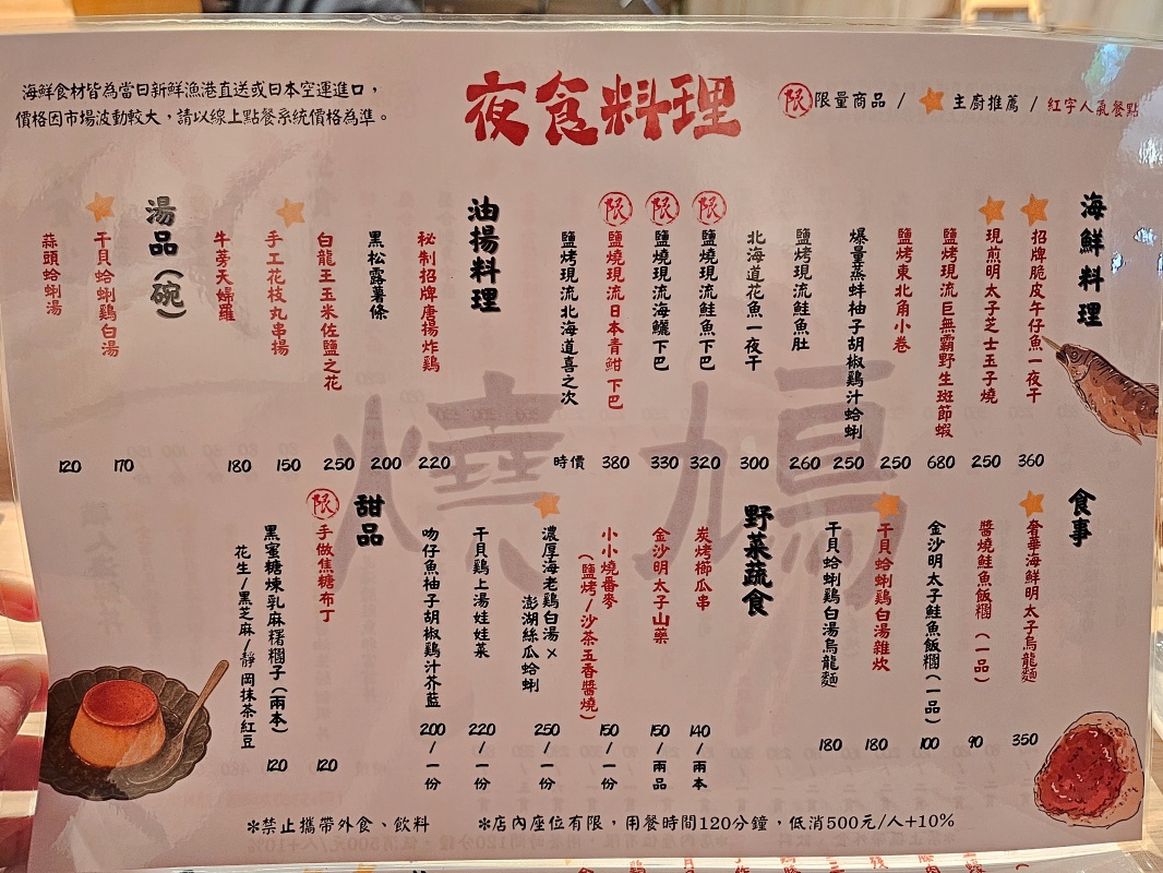 一般訂位 :用餐限時:120 分鐘 |低消:每人 NT$500+10%